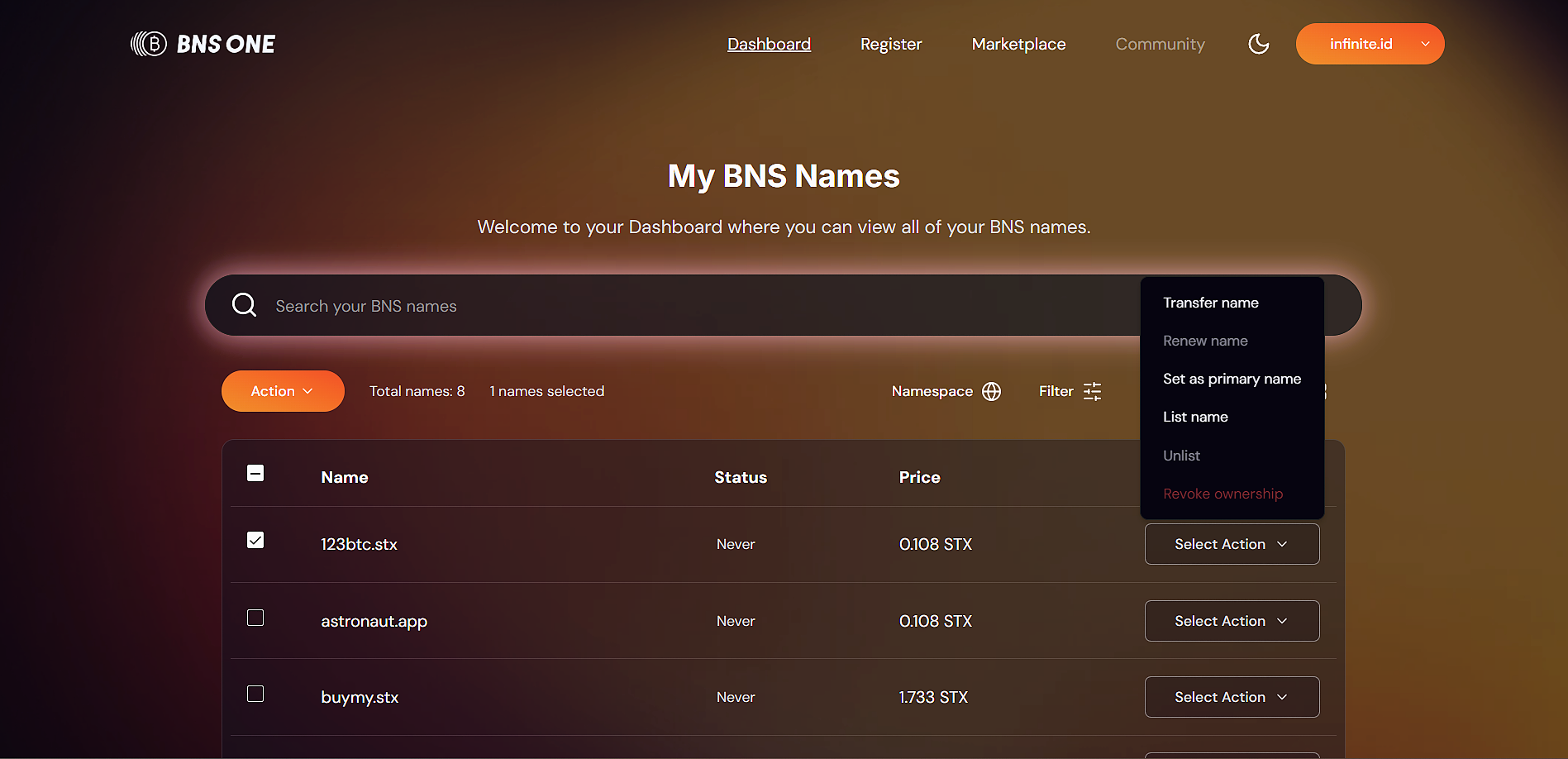 1️⃣ **Go to your Dashboard** and tick the names you want to renew. **Note:** names in the **.app, .stx, and .stacks** namespaces **never expire** and do not require renewal.\